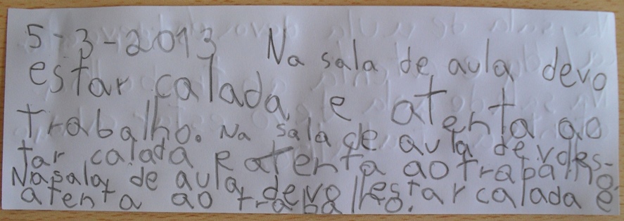 Antes do último castigo ser introduzido, falei com o professor da Vassoura sobre uma ideia que tinha tido: arranjar um bloco pequeno para a Vassoura, na sala, em vez de falar com as colegas, escrever o que lhes queria dizer, levando-o depois para o recreio como lembrete. O professor concordou ("Vale a pena tentar tudo", disse ele), arranjou-se o bloco (chamado "Caderno do Silêncio"), mas... sem resultados à vista.