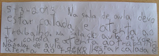 A Vassoura está sem televisão (convenhamos: é um castigo que só lhe faz bem), sem guloseimas (mal não lhe faz - embora antes fossem poucas as que podia comer), sem poder ir a festas de aniversário dos amigos (o que tem sido tão questionado por outras pessoas que tenho andado a repensar a coisa), e, último castigo, tem de escrever todos os dias uma frase alusiva ao comportamento que deve ter. Começou por ter de escrever duas vezes; como não melhorou, agora tem de escrever cinco vezes.