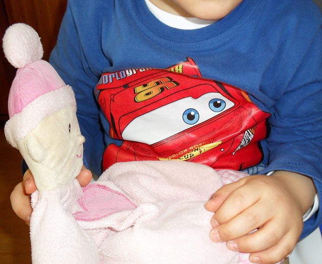 [O boneco cor-de-rosa foi comprado durante a gravidez da Vassoura. Na altura estive indecisa entre o cor-de-rosa e o azul (pois sabia que mais tarde poderia ter um menino), mas o cor-de-rosa venceu. Curiosamente, nem a Vassoura, nem a Varinha, ligaram muito ao boneco, mas o Feitiço afeiçoou-se a ele de uma maneira incrível. É o seu melhor amigo!]