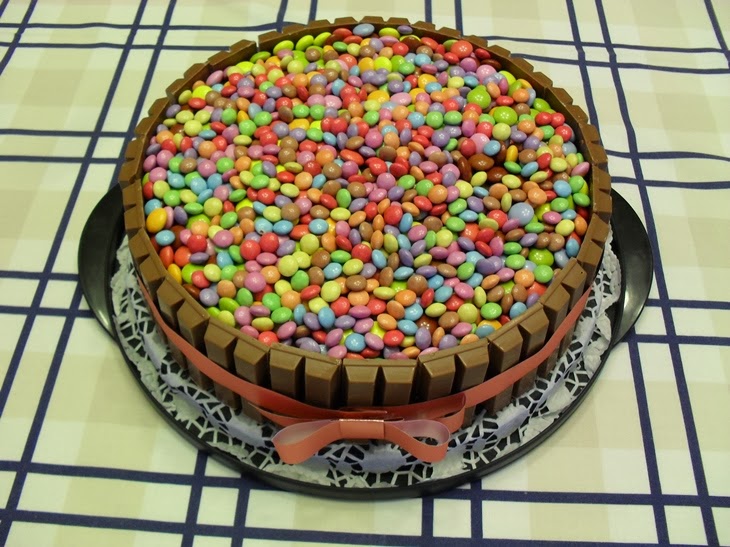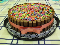 [A receita do bolo, fora a decoração, encontra-se aqui. Para a decoração, usei 12 KitKats, cortados com uma faca imediatamente a seguir ao fim do nome que está em relevo, uma fita de embrulhar de 19 mm de largura (fui eu que fiz o lacinho), 9 tubos de Pintarolas e um pacote inteiro (12 caixinhas) de mini-Smarties. Uma nota para os mais distraídos: se fizerem esta decoração, esperem que o bolo esteja frio, ou o chocolate derrete! Eu só esperei porque me lembraram disto antes de fazer o bolo... :-)]
