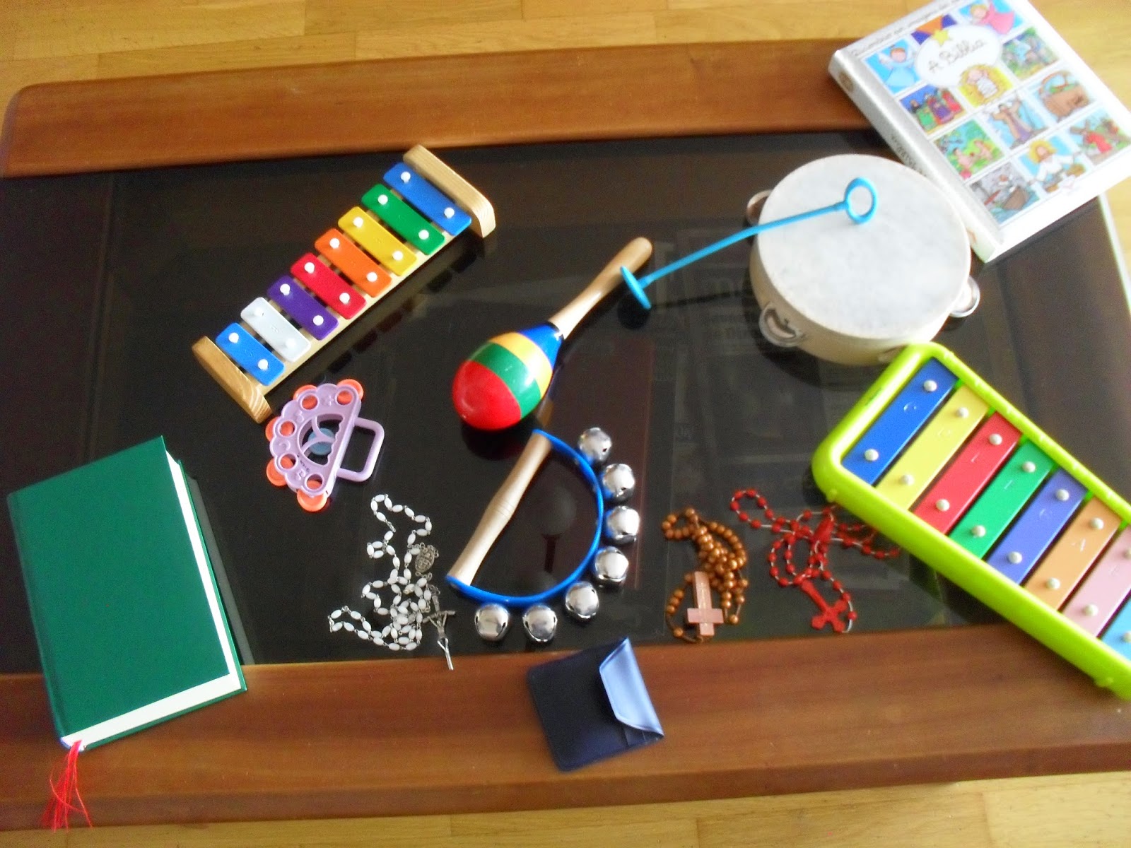 A fotografia seguinte mostra a mesa com os "despojos" da oração. Cada criança escolheu um instrumento, por isso não tocaram todos os que estão na imagem.