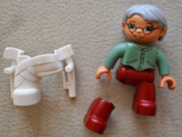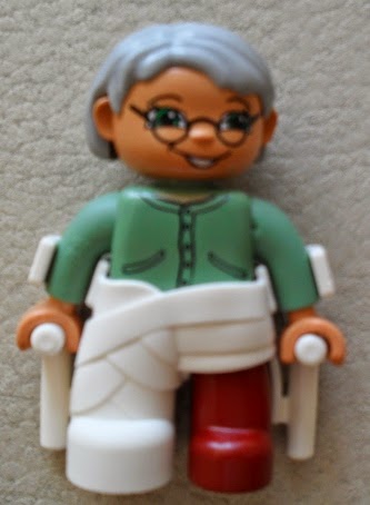 Uma das caixas de Lego Duplo que receberam, em tempos, foi a do hospital. Como os hospitais existem para os doentes e acidentados, uma das peças é para dar a ideia que uma pessoa tem uma perna partida, ficando assim: