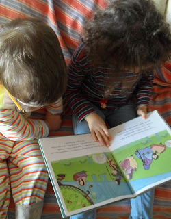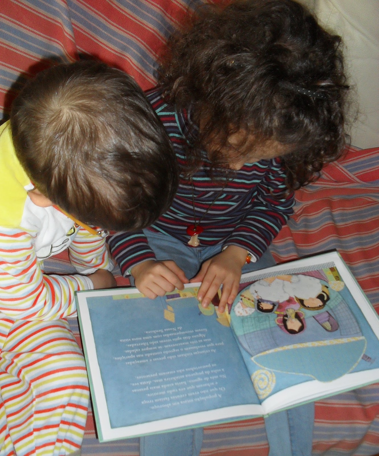 a Varinha perguntou-me: - Podemos ver televisão? Eu: Não. Varinha: Porquê? Eu: Porque para desenvolverem a vossa criatividade precisam de fazer outras coisas. Ver televisão não. Surpreendeu-me a rapidez da aceitação. A Varinha dirigiu-se ao canto de oração, escolheu um livro e perguntou ao Feitiço: Varinha: Queres que te leia "Os três pastorinhos de Fátima"? Feitiço: Sim. Sentaram-se os dois no sofá e lá estão, a Varinha muito concentrada a ler e o Feitiço totalmente silencioso a escutar. Dá gosto ver (e ouvir)! :-) Os caros leitores não podem ouvir, mas podem ver a cena em duas fotografias.