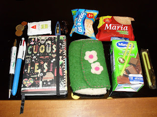 Coloquei a comida na mala no sábado de manhã, antes de sair para uma formação, mas havia um bar no local e optei por comer uma sanduíche e beber um leite de garrafa em vez de consumir o que levara. Como sou muito arrumadinha, o que lá coloquei, lá ficou...
