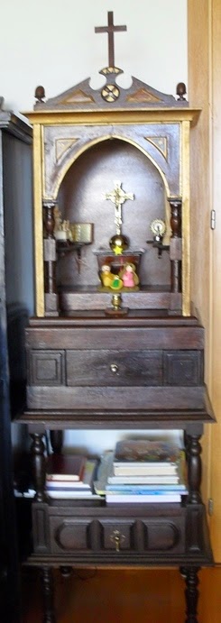 O Rogério lembrou-se que havia um oratório na casa que era dos avós paternos. Confesso que um oratório não era bem o que eu tinha pensado, porque associava um oratório a pessoas idosas. Preconceito estúpido, certamente. Um oratório convida a orar, tal como o nome indica - então pode convidar pessoas de qualquer idade! Mas não disse que não a essa sugestão, já que não descortinava outra melhor, especialmente em termos de espaço (na verdade, lembrei-me de uma hipótese, mas era radical e não foi aprovada pelo Rogério).